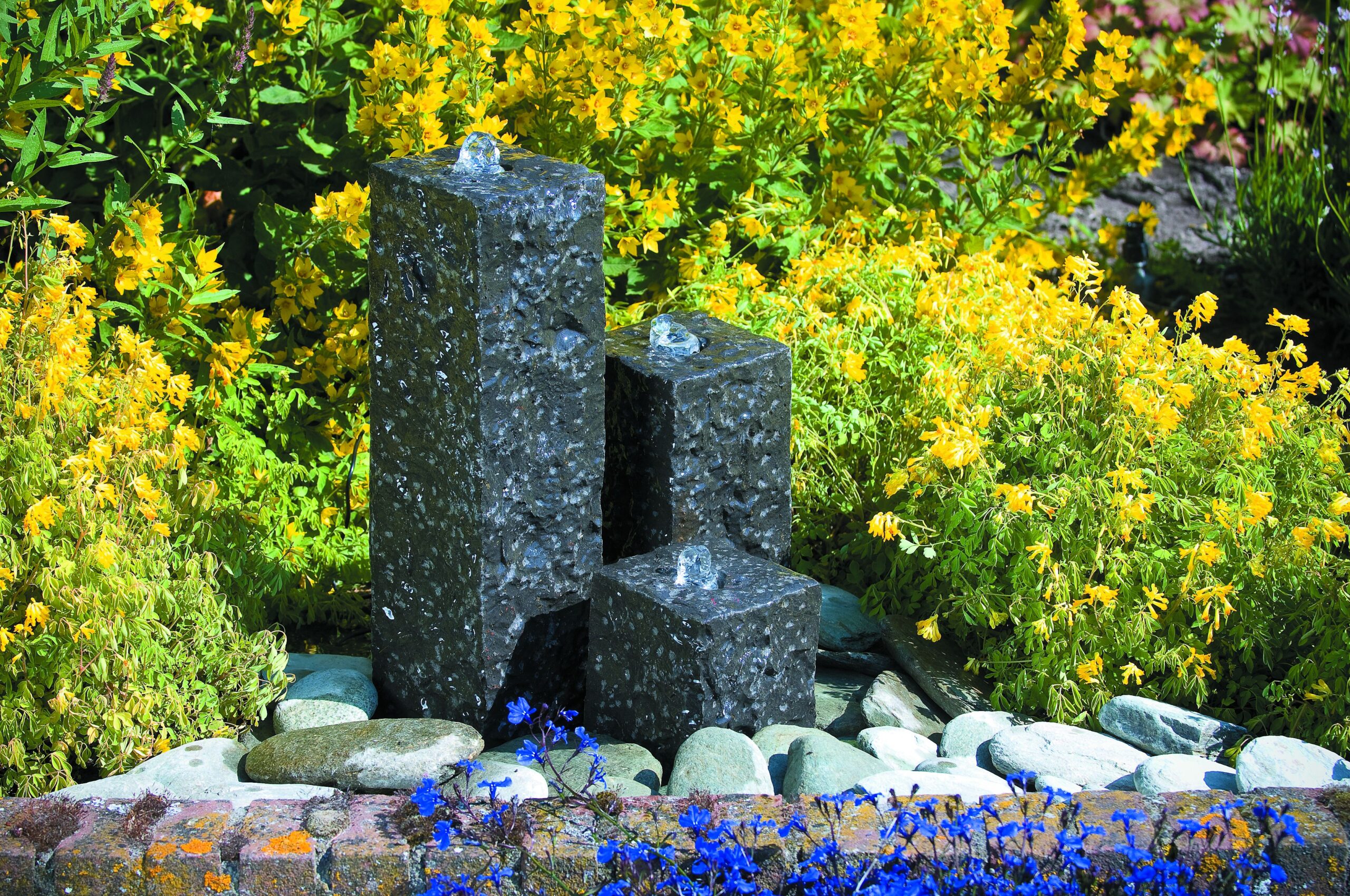 Water in de tuin hoeft niet altijd een vijver te betekenen. Zacht kabbelende waterpartijen worden steeds populairder. Acqua Arte set Modena bestaande uit 3 graniete zuilen met ledverlichting. Complete set met pomp, fonteinbassin, afdekplaat en aansluitmateriaal