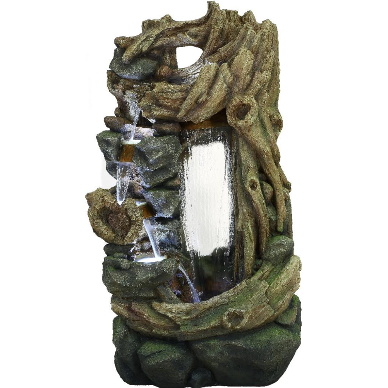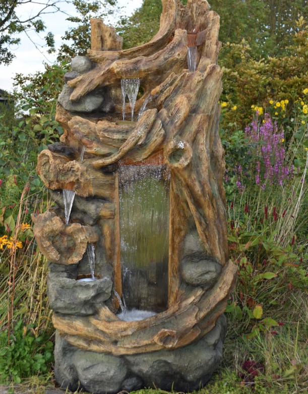 Fontein die een grote boomstam imiteert waaruit het water op twee verschillende manieren stroomt: van bassin naar bassin aan de zijkant en trapsgewijs aan de voorkant.