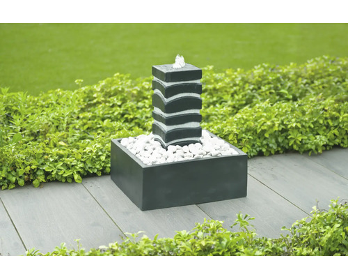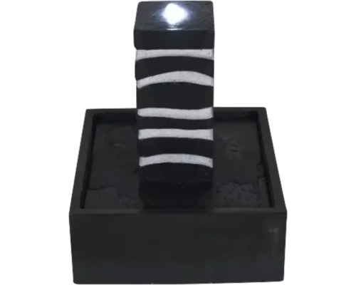 Bij deze vierkante zuil in elegante marmerimitatie met golvende groeven over het hele oppervlak, kleur zwart, stroomt het water door een ledverlichte uitloop zachtjes naar beneden naar een schaal in dezelfde kleur. Een compleet waterornament Borgo van Ubbink, Direct klaar voor gebruik. Afmetingen: H58 x 50 x 50 cm. Gelever met: pomp 600 l/u, ledverlichting 1×8 warmwit 40 lumen 2,5W, aansluitmateriaal en een transformator.