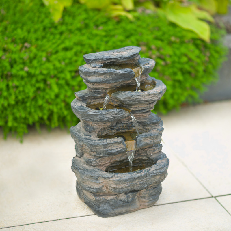 De Miras-fontein, een decoratieve mini-waterval in polyresin-imiterende steen, zorgt voor een rustgevende sfeer buitenshuis, op uw terras of zelfs binnenshuis, dankzij het gesloten circuit en de individuele watertank .