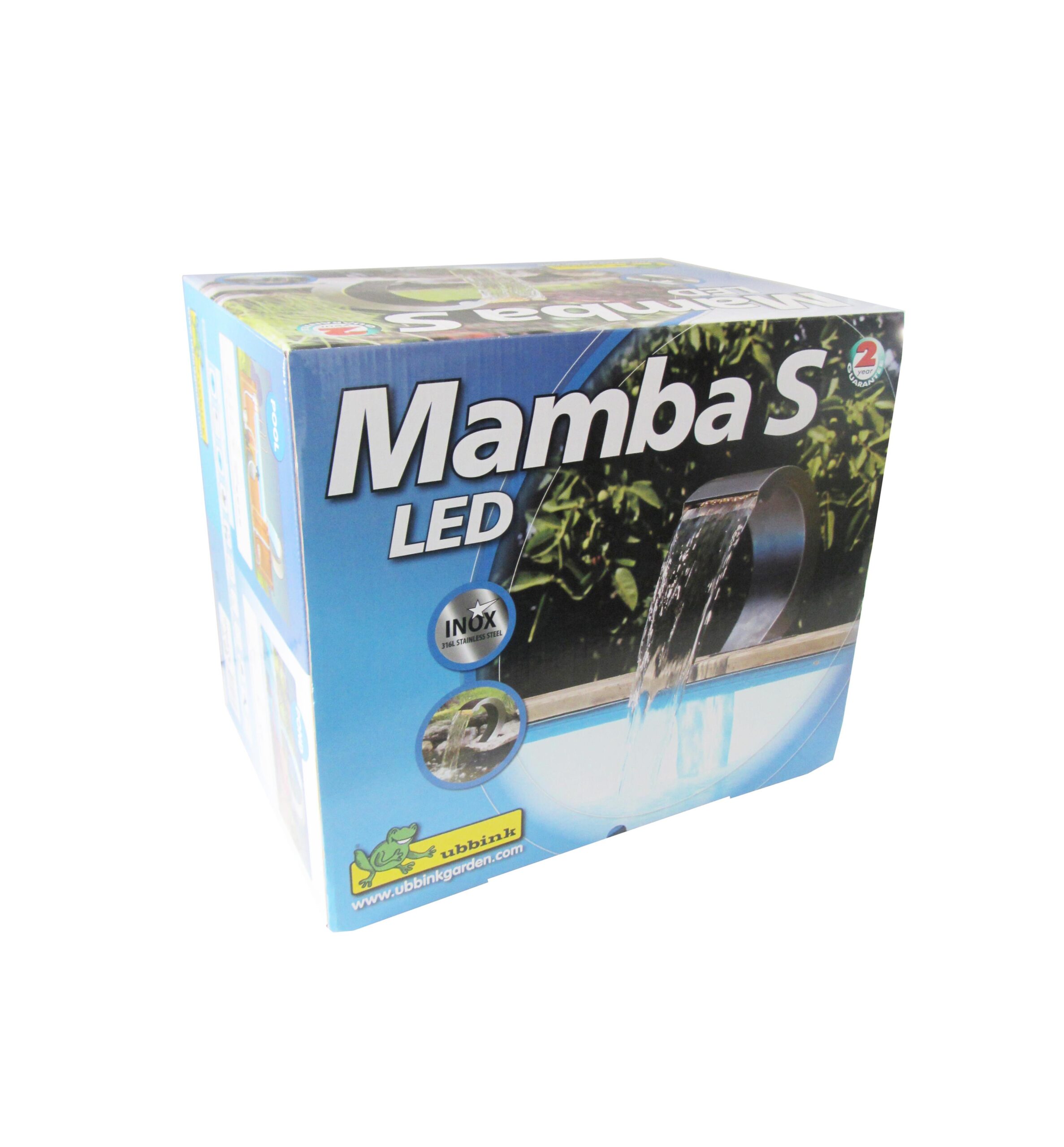 De Mamba waterval is een ideaal object dat zorgt voor rust en een prettige sfeer. Deze kleine designwaterval is geheel vervaardigd van roestvrij staal dat bestand is tegen chloor (type 316L). Door het speciale ontwerp en de degelijke afwerking blijft de dikte van de waterstraal altijd gelijk. De Mamba S-LED waterval is voorzien van ledverlichting en geschikt voor vijverpompen met een circulatievermogen van ca. 6.000 liter.