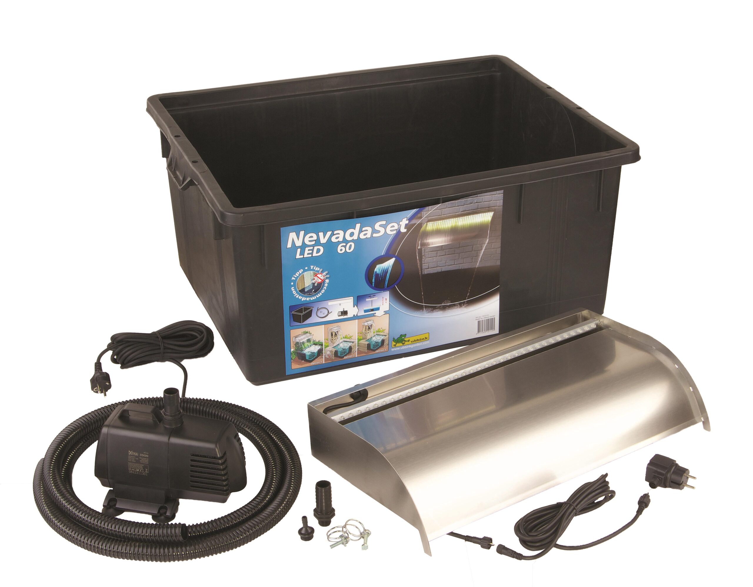 Complete watervalset Nevada 60 met ledverlichting met een maximale montagehoogte van 50 cm. incl. waterval Nevada 60 leds, pomp 3900 l/h, 1,5 meter vijverslang en container 150 L.